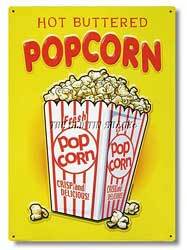 Title (ebay affiliate link): Nostalgic Tin Metal Sign - Hot Buttered Popcorn Movie Snack Mike Patrick #MP-01