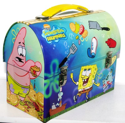 Title (ebay affiliate link): Nickelodeon 2001 SpongeBob SquarPants Snack Lunch Tote Metal Tin Box Container