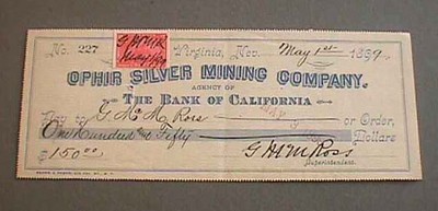 Title (ebay affiliate link): NICE! 1899 old OPHIR SILVER MINING CO revenue stamped check VIRGINA CITY NEVADA