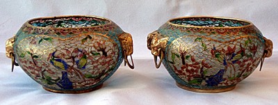 PAIR VINTAGE PLIQUE A JOUR ENAMELED DOUBLE HANDLED BOWLS BIRDS