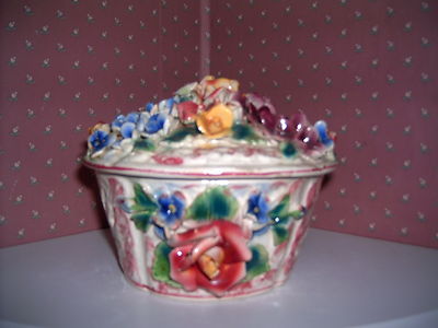 Title (ebay affiliate link): Vintage CAPODIMONTE STYLE Covered Lattice Bowl embossed FLOWERS Numbered ITALY
