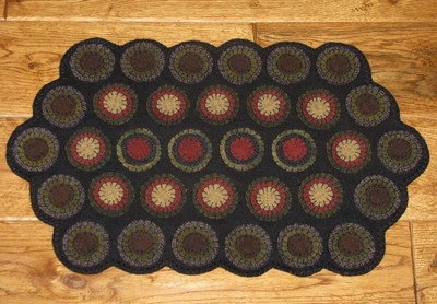 Title (ebay affiliate link): Primitive Wool Penny Rug ~ Handstitched ~ Browns, Greens, Mustard, Pepperberry