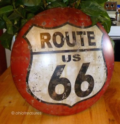 nostalgic ROUTE 66 metal SIGN shaped like a hubcap CAR auto