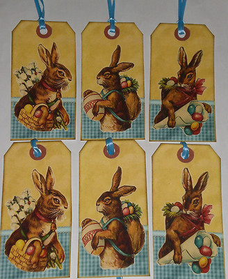 6 Primitive Whimsy Vintage Easter Bunny Hang Tags Gift Ties Place Cards Ornies