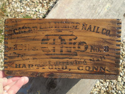 VINTAGE ADVERTISING WOODEN BOX HORSE SHOE NAIL WOOD OLD HARTFORD CT BLACKSMITH