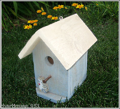 VTG Estate Handcrafted Barn Wood Blue Bird House Rusty Nail Perch Gray Tabby Cat