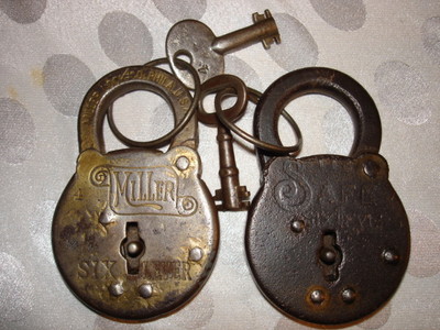 Title (ebay affiliate link): (2) Antique Six Lever Padlock Lock (s) Miller & Safe w/ Keys