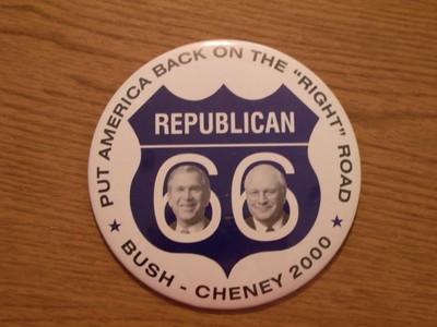 Title (ebay affiliate link): George Bush and Dick Cheney America back on the Right Road 6 inch Cello Button