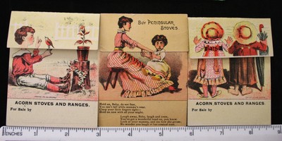 LOT of Three 1880s METAMORPHIC ACORN STOVE VICTORIAN TRADE CARDS~STRANGE FOLKS