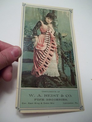 Title (ebay affiliate link): VICTORIAN TRADE CARD W.A. REIST GROCERIES LANCASTER PA WOMAN PINK DRESS
