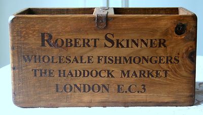 Vintage wooden fishmongers box trug planter, industrial robert skinner scallops