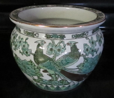 Title (ebay affiliate link): Japan Japanese Hand Painted Planter Pot Bowl Vase Gold Imari Jade Green Peacocks