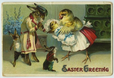 Title (ebay affiliate link): Vintage 1910 Embossed Easter Greetings PC Mama & Baby Chick With Rabbits