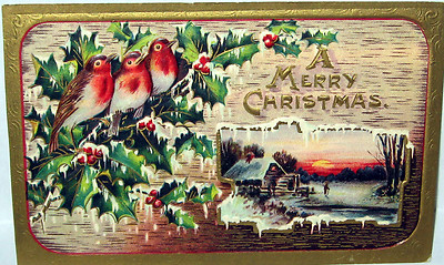 Title (ebay affiliate link): 1910 POSTCARD MERRY CHRISTMAS RED BREAST ROBINS ON HOLLY BERRIES