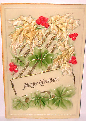 Title (ebay affiliate link): 1911 CHRISTMAS POSTCARD CELLULOID FRONT WITH SHAMROCKS & HOLLY