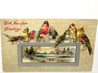 Title (ebay affiliate link): 1909 POSTCARD NEW YEAR GREETINGS, 9 MULTI-COLOR BIRDS