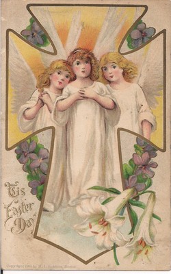 Vintage Easter Postcard-Tis Easter Day-Large Cross with Three Girl Angels-flower