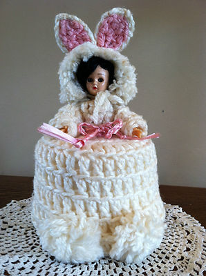 Title (ebay affiliate link): Vintage Hand Crocheted Bunny w/ Doll Toilet Paper Holder