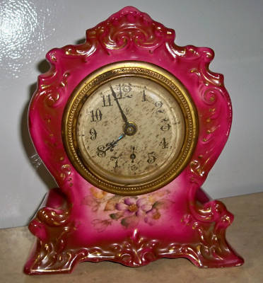 7" ANTIQUE GILBERT ROSE COLOR PORCELAIN MANTEL CLOCK