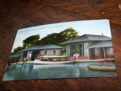 1910 postcard Jackson Park boathouse Chicago, great military message, deserter