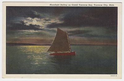 Title (ebay affiliate link): 1940s Postcard Sailing Sailboat Grand Traverse Bay Traverse City Michigan MI