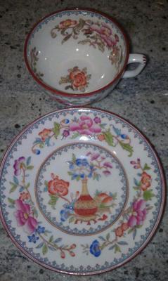 Title (ebay affiliate link): CAULDON ENGLAND EST 1774 TEACUP AND SAUCER RED & BLUE RIM FLOWERS ANTIQUE