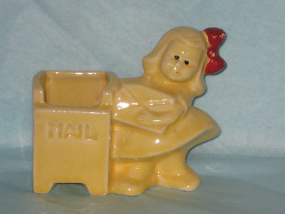 Vintage yellow art pottery girl mailing letter mail box planter big red bow