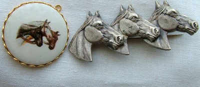 Vintage C Clasp Metal Horse Head Brooch Pin Milk Glass Painted Horses Pendant