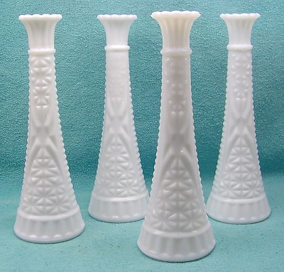 Title (ebay affiliate link): Lot of 4 Matching Milk White 9 "Flower Bud Vases all Same Pattern