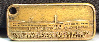 GENERAL MOTORS CORP BRONZE KEY CHAIN CHARM TAG - MARCELLUS St & TOWN LINE PLANTS
