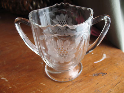 VINTAGE OPEN SUGAR DISH PRESSED GLASS WITH HUGHES CORNFLOWER PATTERN