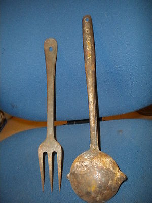 OLD CAST IRON LADLE HAS ON IT L I D LC C NO 4 AND FORK