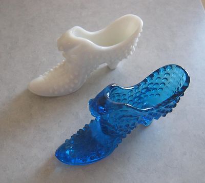 Title (ebay affiliate link): 2 Fenton Hobnail Cat Milk Glass and Cobalt Blue Glass Slippers
