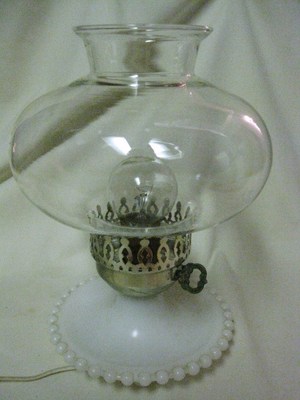 Title (ebay affiliate link): Vintage Milk Glass Base Table Lamp Beautiful Shape Shade Globe Works