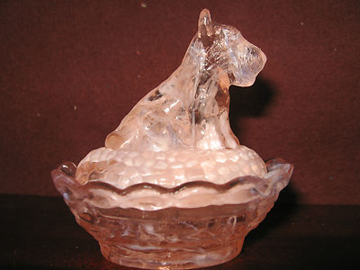 pink and white milk slag glass scottie dog salt cellar / celt on nest basket dip