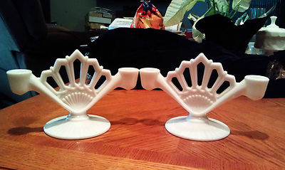Title (ebay affiliate link): VINTAGE FOSTORIA PAIR OF MILK GLASS DOUBLE CANDLE HOLDERS IN ARLINGTON PATTERN