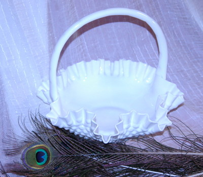 Title (ebay affiliate link): WHITE MILK GLASS BASKET Hobnail Centerpiece Scalloped Edges Wedding Decoration