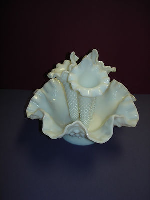 3 HORN EPERGNE MILKGLASS HOBNAIL ONE HORN DAMAGED