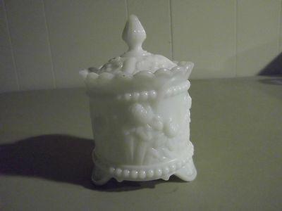 Title (ebay affiliate link): White Milk Glass Lidded Jar with Tulip Decoration (footed)