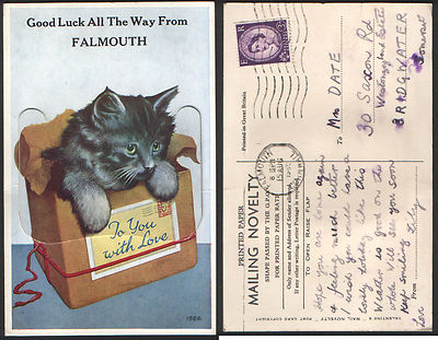 vintage postcard Good Luck from Falmouth grey cat parcel...flap reveals 12 views