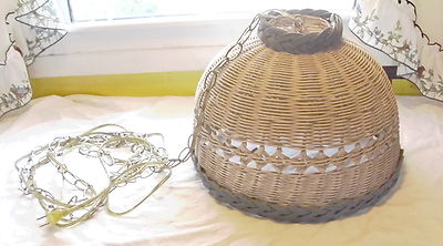 Vintage Wicker Rattan Hanging Lamp 1960's Blue & White Works L@@K