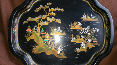 Title (ebay affiliate link): Vintage England Tin Vanity Serving Tray Asian Style China Garden Baret Ware