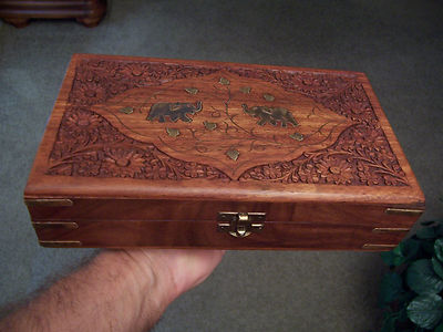 Title (ebay affiliate link): 10" LATCHING SOLID WOOD BOX WITH LOTS OF CARVING, BRASS INLAY & HARDWARE