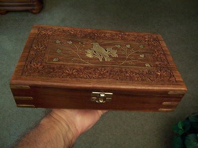 Title (ebay affiliate link): OLDER 10" LATCHING SOLID WOOD BOX WITH LOTS OF CARVING - BRASS INLAY & HARDWARE