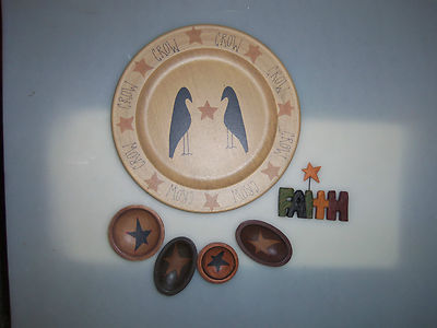 Title (ebay affiliate link): LOT DECORATIVE PRIMITIVE CROW PLATE; SMALL BOWLS; FAITH; STAIRS