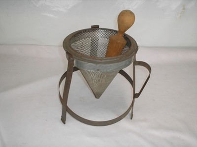Title (ebay affiliate link): Antique Primitive Metal Tin STRAINER Juicer Sieve w/ Wood Pestle Masher Kitchen