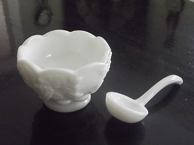Title (ebay affiliate link): VINTAGE WESTMORELAND MILK GLASS CONDIMENT DISH W/SPOON PANELED GRAPE