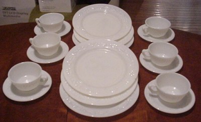 Title (ebay affiliate link): VINTAGE 1940'S MILK GLASS 18 PIECE SET HAZEL ATLAS 6 9" PLATES 6 CUPS 6 SAUCER