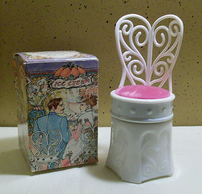 Title (ebay affiliate link): Avon - Sweet Shoppe Pin Cushion - Milk Glass Jar & Box - Moonwind Cream Sachet