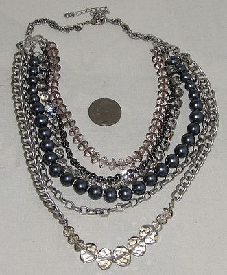 Title (ebay affiliate link): 6 STRAND ANTIQUE SILVERTONE FAUX PEARLS SILVER CRYSTAL CHAIN NECKACE